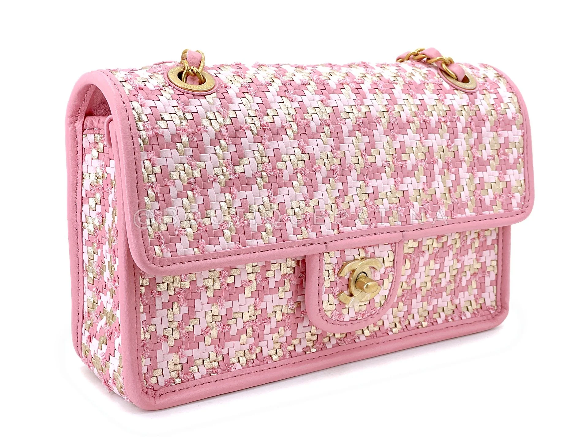 Another bag preserved in excellent-pristine condition with sticker still on hardware, is this Chanel 23C Woven Houndstooth Pink Gold White Flap Bag GHW.